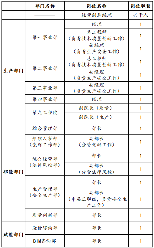 1、事業部:經理1名,總工程師1名,生産(含安全)副經理1名,質量副經理1名。