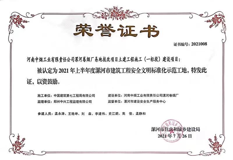 漯河卷煙廠易地技改項目土建工程 榮獲漯河市建築工程安全文明标準化示範工地